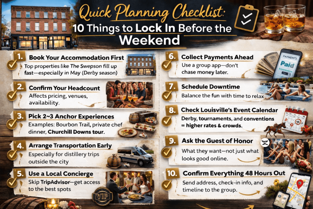 Lock in a place that actually fits your group first. That could be a large private rental or a full property where everyone stays together. Then plan around a few key experiences like a Bourbon Trail day, a private chef dinner, and a night out. Have someone local handle the logistics so you don’t have to juggle details all weekend.